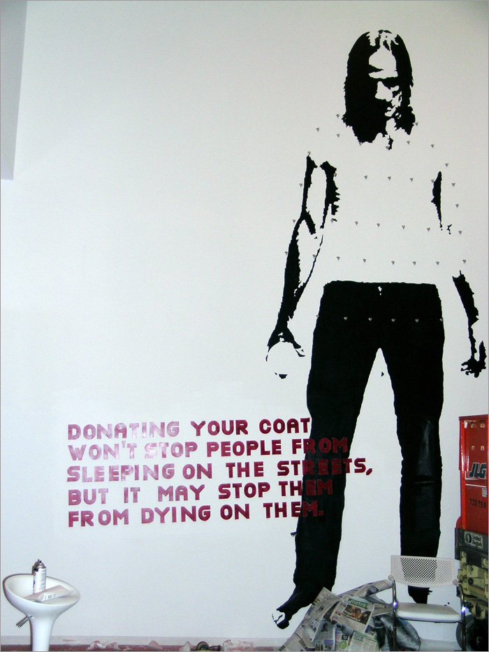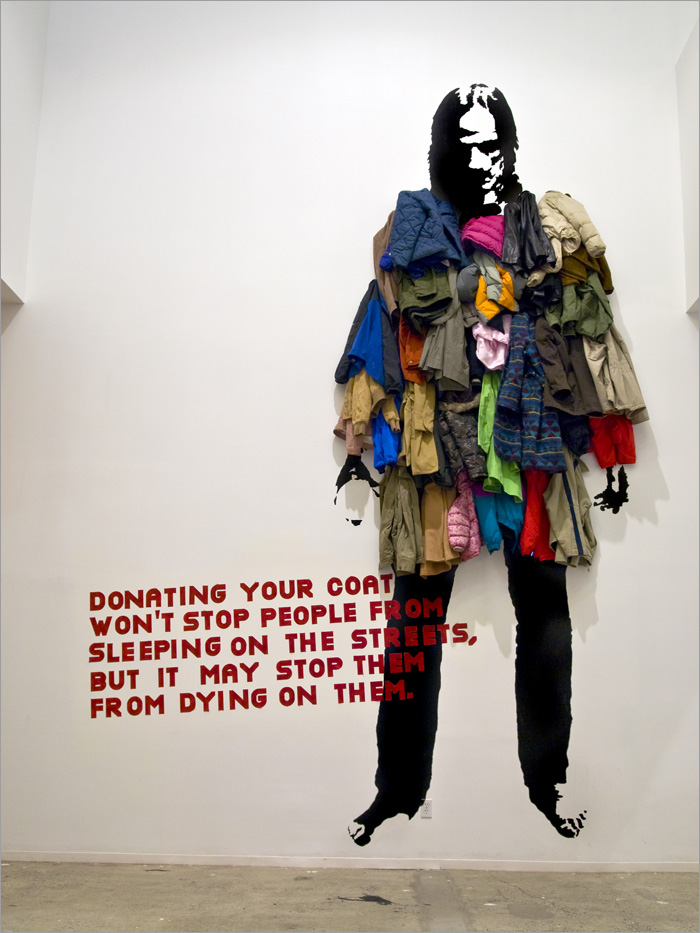 Consiste en una pintura realizada en la pared de un "sin techo" con una serie de perchas para que la gente done sus abrigos y los cuelgue en la pintura. Con los abrigos colgados se consigue hacer la figura abrigada del hombre. Con una escritura a sus pies que viene a decir: "Donando tu abrigo no conseguirás que la gente no duerma en la calles, pero podrías evitar que muera en ellas"
